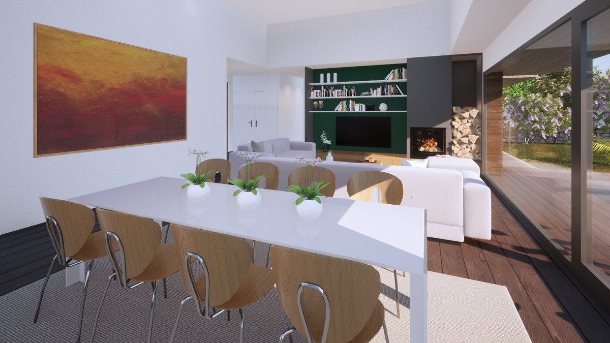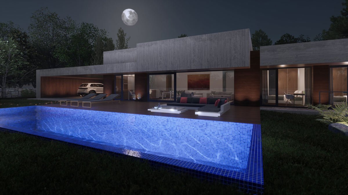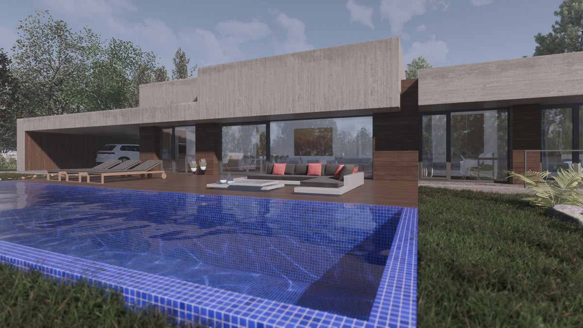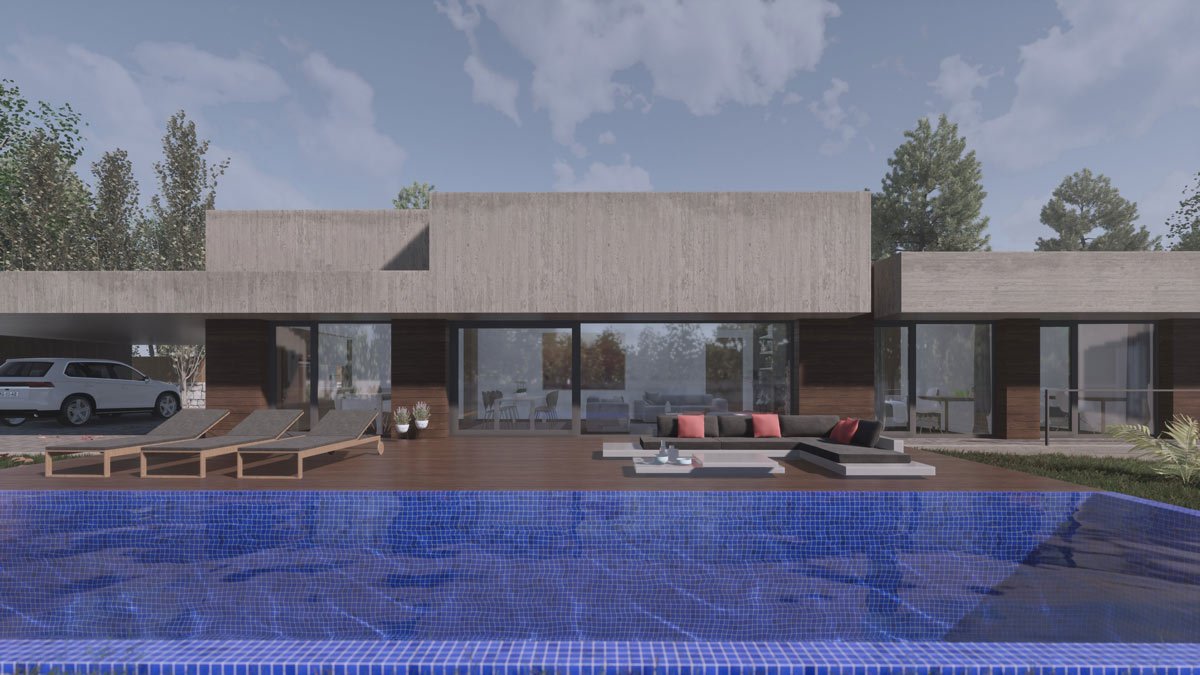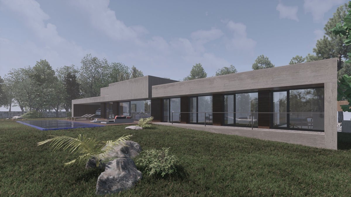 En un entorno rural la vivienda tiene un programa de cuatro dormitorios, una zona de estar- comedor que se pueda separar de la cocina cuando sea necesario y zona de servicios. Los clientes pedían una vivienda de una planta, a pesar de que la diferencia de nivel entre la parcela y la vía de acceso es de tres metros. La posición de la edificación divide la parcela en dos zonas: una de acceso, a donde se orientan los espacios de servicios y otra de disfrute, situada al sur donde se encuentra la piscina que se relaciona directamente con el salón comedor. Se traslada la zona de estacionamiento hacia la parte más alejada de la carretera, a la que se accede a través de una rampa, consiguiendo así llegar al nivel de planta de la vivienda en donde se desarrolla el programa solicitado. Se consigue de este modo una vivienda funcional adaptada a las necesidades de la familia.